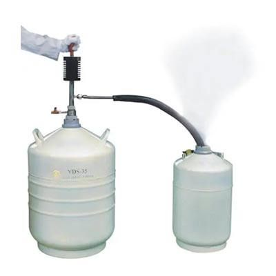 該產品依靠操作者手捏吸液球(ZYB-5型),使液氮容器內貯存的液氮少量產生氣化。由于液氮的氣液體積比較大,氣化后的氮氣在密封的容器內對盛裝的液氮增壓,促使容器內盛裝的液氮排放出來,達到對其它容器補充液氮的目的。它具有操作方便可靠、排液過程中液氮的蒸發損失低的優點。